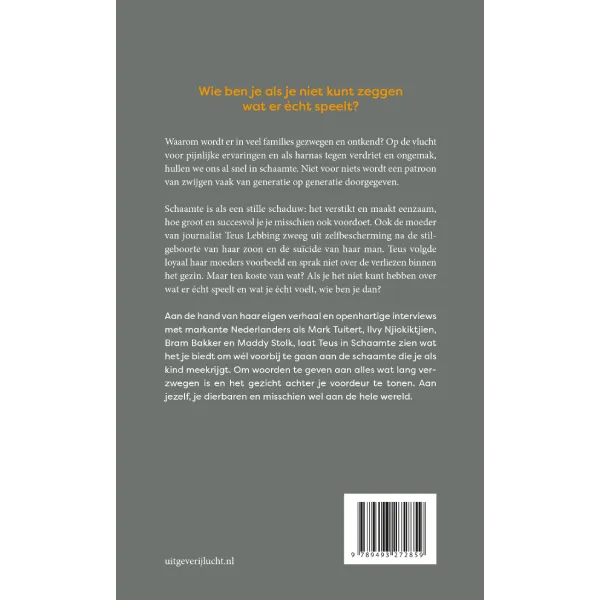 Aan de hand van mijn eigen verhaal en openhartige interviews met markante Nederlanders, laat ik in Schaamte zien wat het je biedt om wel voorbij te gaan aan de stille schaduw die schaamte is. Hoe je de moed kunt vinden om je ware gezicht te tonen – aan jezelf, je dierbaren en misschien wel aan de hele wereld. En wat dat je oplevert: ruimte, energie, oprecht contact, een leven trouw aan jezelf.